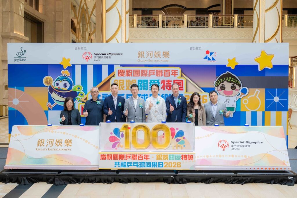 「慶祝國際乒聯百年・銀娛關愛特奧乒乓球同樂日2026」於3月29日上午於「澳門銀河」東翼廣場盛大舉行。在開幕儀式中,多名嘉賓出席,包括中央人民政府駐澳門特別行政區聯絡辦公室社會發展部四級調研員陳琨;澳門特別行政區政府體育局體育發展廳代廳長陳凱風;立法會議員黃駿傑;國際乒聯賽事總監巴爾特・維爾莫森(Bart Vermoessen)先生;銀娛公共關係企業社會責任副總裁呂倩姬;特奧會理事長施達明,以及特奧會執行總監蕭宇康等嘉賓。