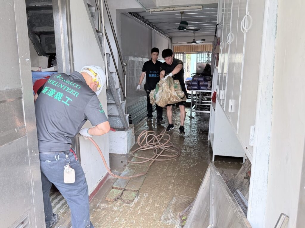In Southern District, 30 Melco volunteers collaborated with the Macao Federation of Trade Unions (FAOM) to assist residents and SME businesses impacted by the flooding. Volunteers helped return displaced items, remove garbage and debris, and restore safe and clean environments.