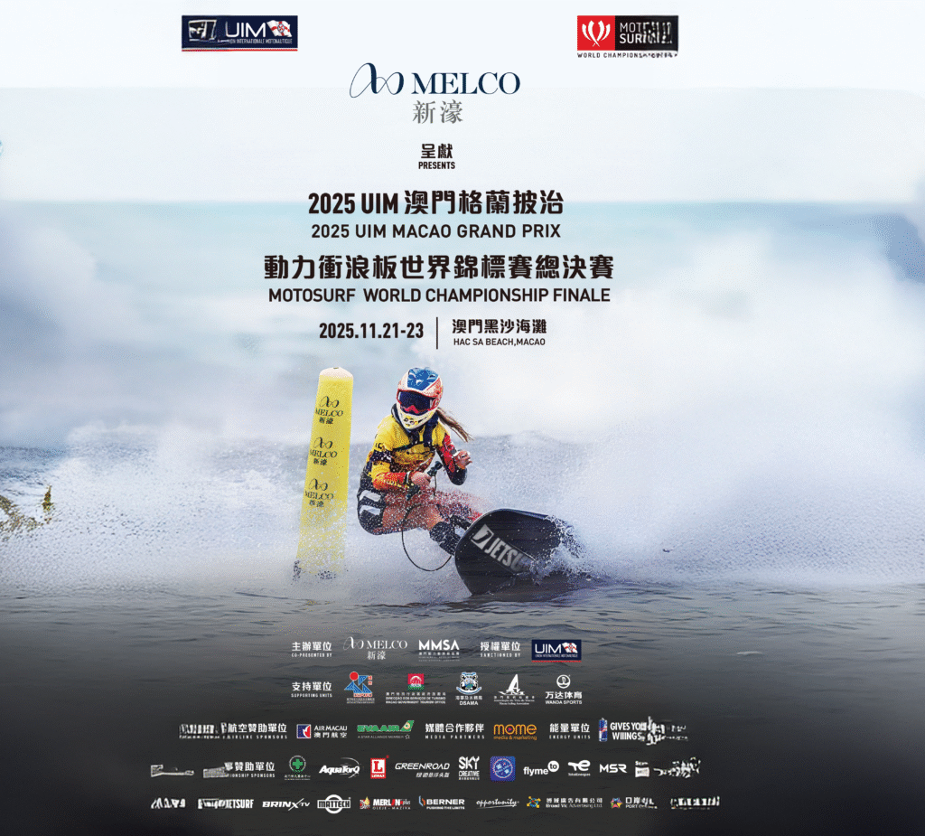 Melco Resorts & Entertainment and the Macau Motosurf Association are co-organizing the 2025 UIM Macao Grand Prix MotoSurf World Championship Finale, which is sanctioned by the Union Internationale Motonautique (UIM). The event will take place at Hac Sa Beach from 21 to 23 November.