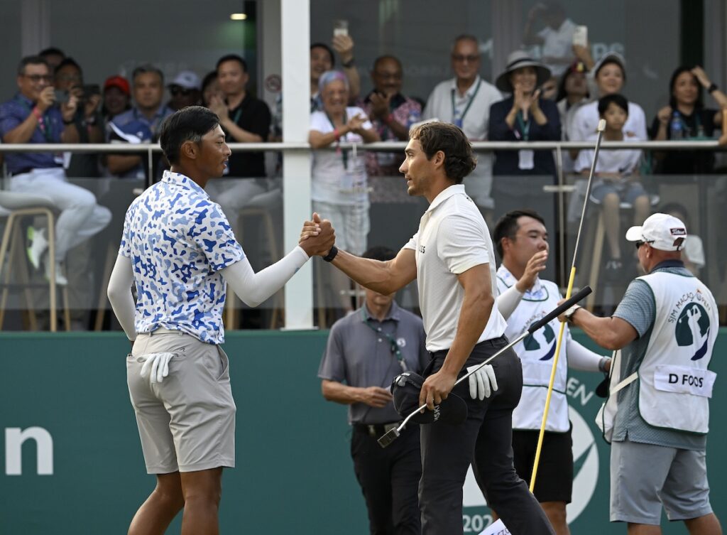 MACAU, CHINA: (L- R)- Wang Wei-hsuan of Chinese Taipei and Dominic Foos of Germany shake hands after the 18th hole play-off pictured during Round Four on Sunday October 19, 2025 at the Macau Golf and Country Club during the SJM Macao Open. The US$1 million Asian Tour event is staged from October 16-19, 2025. Picture by Paul Lakatos/IMG